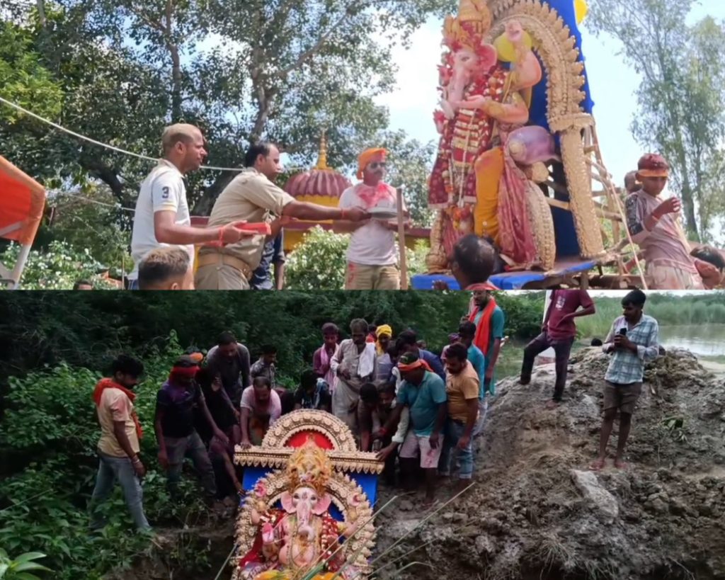 असनी गंगा घाट के निकट विसर्जित की गई प्रतिमा। एसआई ने भगवान गणेश की आरती कर सुख और समृद्धि की प्रार्थना की।