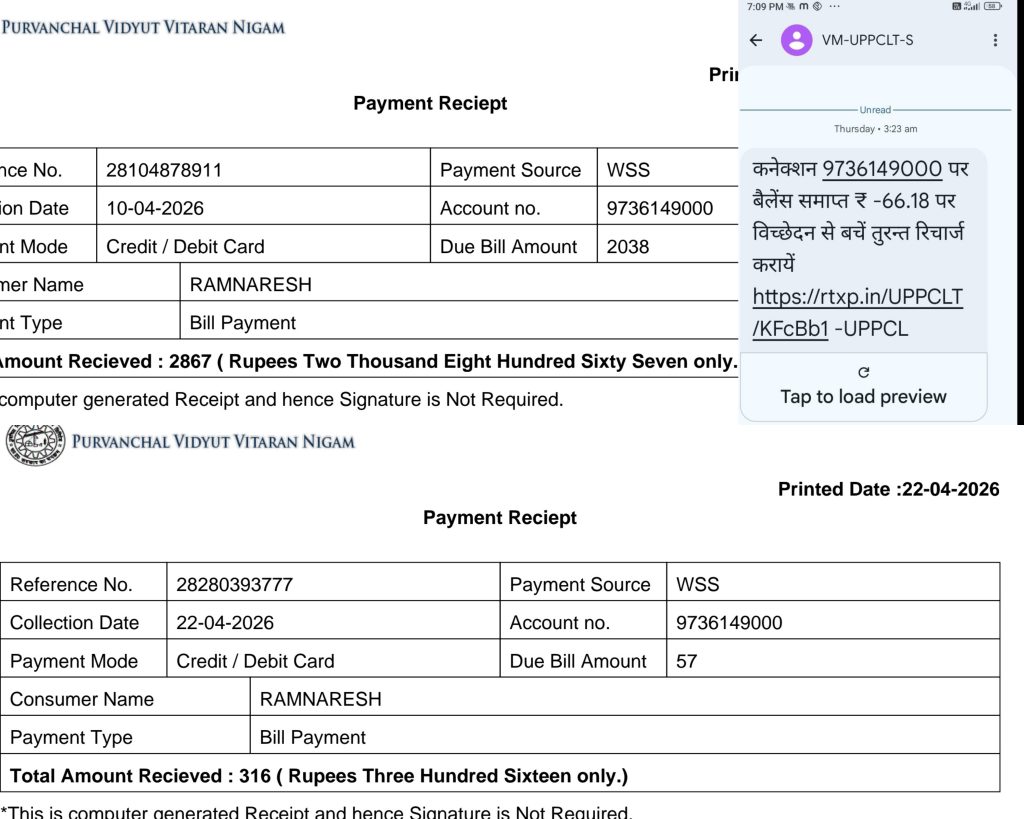 जानकारी के अनुसार, महादेवपुर गांव निवासी उपभोक्ता रामनरेश ने 10 अप्रैल 2026 को विद्युत विभाग में 2867 रुपये का बिल जमा किया था। भुगतान की रसीद भी उपभोक्ता के पास मौजूद है। इसके बावजूद 21 अप्रैल 2026 को अचानक उपभोक्ता के मोबाइल पर 66.18 रुपये बकाया होने का मैसेज आया और कुछ ही देर बाद बिजली सप्लाई बंद कर दी गई।